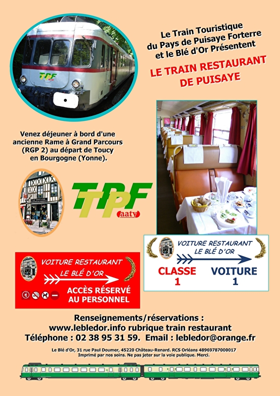 Le Train Touristique du Pays de Puisaye-Forterre et Le Blé d'Or, restaurant à Château-Renard (Loiret), vous proposent de voyagercomme autrefois en train restaurant, au départ de Toucy. Tout en roulant